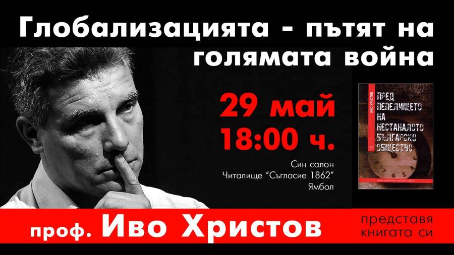 29.05.2018 год. (вторник) - Син салон на читалище "Съгласие", 18:00 часа, среща - дискусия на тема "Глобализацията - пътят към голямата война" с проф. Иво Христов - народен представител от "БСП за България".