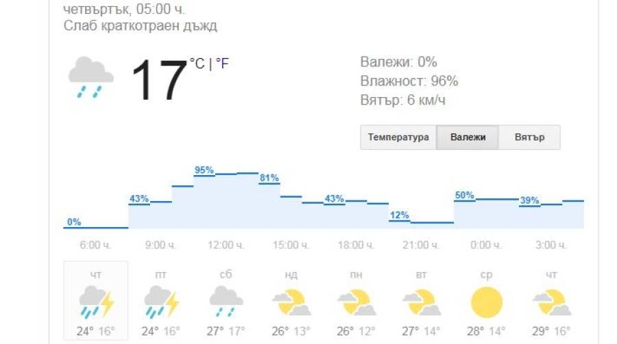През нощта валежите ще отслабнат и в по-голямата част от страната временно ще спрат, с изключение на Рило-Родопската област. На 28.06.2018 г. от юг-югозапад валежите отново ще се активизират, ще обхванат страната и отново на много места ще са значителни по количество. Ще продължи да духа до умерен вятър от изток-североизток. Ще се задържи хладно за края на юни с максимални температури между 20° и 25°. През нощта срещу петък, главно в западната половина от страната валежите ще продължат, като значителни ще бъдат в Северозападна България.