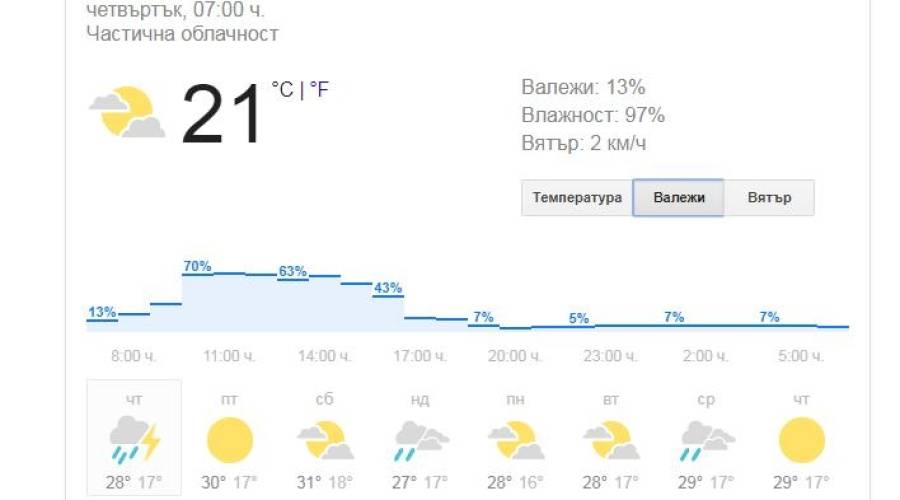 На 05.07.2018 г. времето ще остане неустойчиво в централните и източните райони, както и в Рило-Родопския масив. По-значителни ще са явленията, по-късно след обяд, в Източна България и Родопската област. Ще има и градушки. Максимални температури между 28° и 33°.