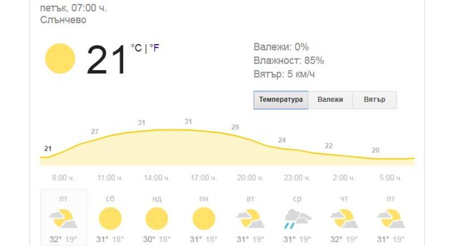 На 13.07.2018 г. ще бъде слънчево. След обяд на много места ще се развива купеста и купесто-дъждовна облачност и главно в планинските и източните райони от страната ще има краткотрайни, временно интензивни валежи и гръмотевична дейност. Възможни са и градушки. Ще духа слаб до умерен вятър от запад-северозапад. Максималните температури ще са предимно между 29° и 34°.