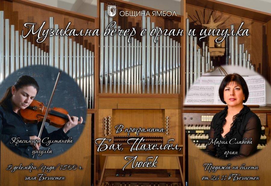 На 5 декември, сряда, от 18:00 часа, почитателите на класическата музика имат възможност да се насладят на Музикална вечер с орган и цигулка в зала „Съвременност“ на Културно-информационен център „Безистен“.