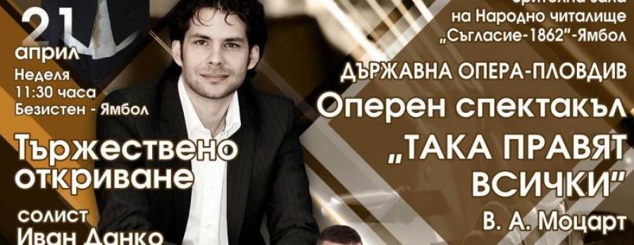 През втората вечер на фестивала в Ямбол гостува Държавна опера Пловдив с оперния спектакъл „Така правят всички“ от Волфганг Амадеус Моцарт. Изключително забавният сюжет на операта е базиран върху едноименната комедия на Уилям Шекспир. Представлението на пловдивската опера е гаранция за класически хумор и прекрасни мелодии в Зрителната зала на читалище „Съгласие“ на 22 април (понеделник), от 19:00часа.