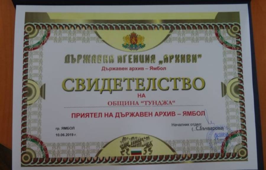 На 11 юни 2019 грамотата бе връчена на кмета на община „Тунджа“ Георги Георгиев от Светлана Василева-началник отдел. Те обсъдиха доброто сътрудничество, израз на което е и календара на община „Тунджа“ за 2019 година, както и реализирането на много други дейности.