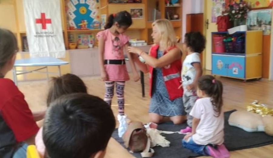 По време на демонстрацията, под формата на игра деца на възраст 4-6 години бяха запознати със значението на първата помощ за предпазване от травматизъм и спасяване на човешки живот; с материалите, които се използват за да помагат на своите връстници; как да измерят пулс и да проверят дишането на пострадал в безсъзнание.