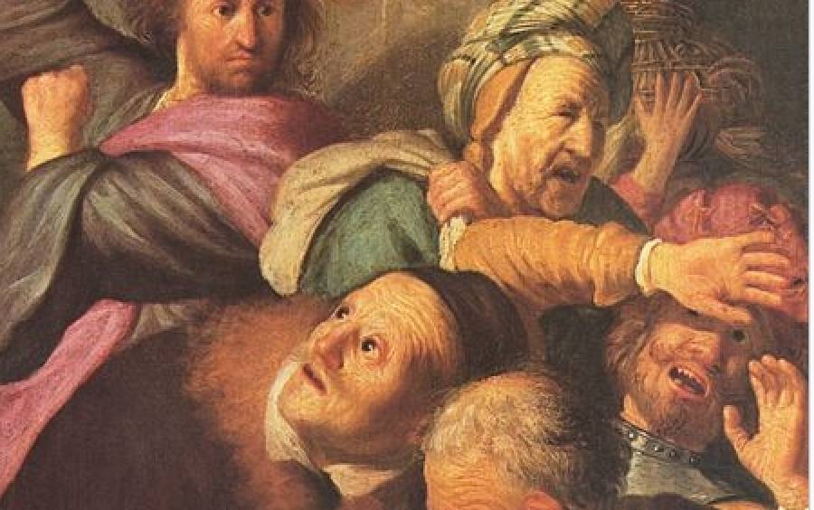 Марко 15. Дойдоха в Иерусалим. Иисус, като влезе в храма, почна да пъди продавачите и купувачите в храма; и прекатури масите на менячите и пейките на гълъбопродавците;