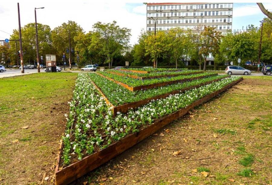 Композицията, съставена от 16 000 цветя - 10 000 теменужки и 6000 лалета, се очаква да разцъфне напълно през пролетта.