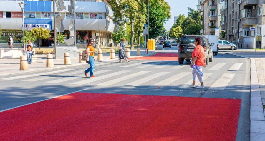 Трайна противохлъзгаща маркировка с дебелина около 4 мм беше поставена пред една от най-натоварените пешеходни пътеки в Ямбол на улица "Преслав".
