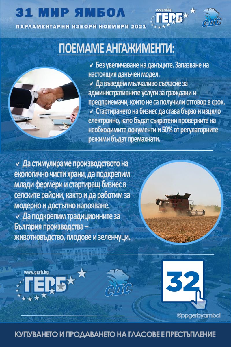 За земеделски район ката ямболски от изключителна важност и интерес са ангажиментите, които поема ГЕРБ-СДС към този сектор. Да бъде стимулирано производството на екологично чисти храни, да бъдат подкрепени млади фермери и стартиращ бизнес в селските райони, както и да се работи за модерно и достъпно напояване. Това заедно с подкрепа за традиционните за България производства – животновъдство, плодове и зеленчуци са конкретни поети ангажименти заложени от демократичната коалиция.