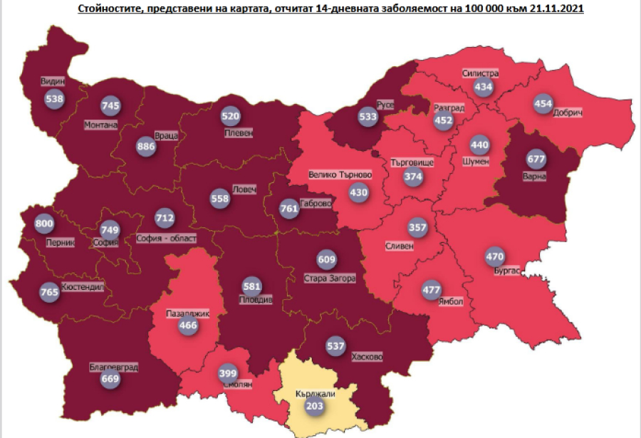 Тук и графично, към 21 ноември, виждаме, че има намаляване и вече 12 области от 28 са 42 процента под 500, а не 93 процента над..., както твърди правителството