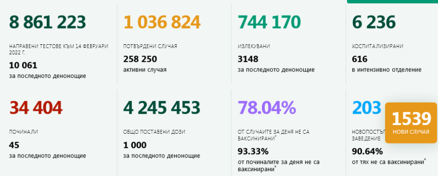 1568/1575 бяха/, на сто хиляди е 1346.084/беше 1352.09/. Поставени инжекции в областта няма. Бустерите си остават 10826. 1502 са т.нар активни случаи /изолираните хора/ в областта. Били са 1491
