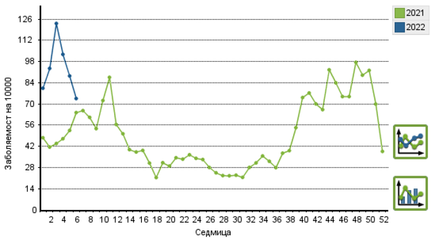 Става дума за периода 7-13 февруари, когато с такива оплаквания, лекарски кабинети в областта са посетили 70 човека. Това е 103.86 на 10 000 души. За страната средното ниво е 73.60. Всъщност има спад в сравнение предния едноседмичен период, съответните числа са били 123.15, и 88.47.