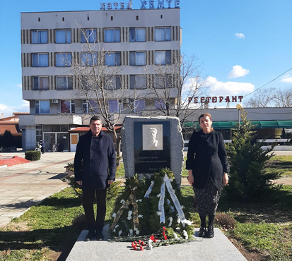 Венци пред паметната плоча на Васил Левски в град Стралджа от председателя на ОбС- Стралджа инж.Иван Митев, кмета на Община Стралджа Атанас Киров , секретаря на Община Стралджа Роска Стойкова, началник отдел " Хуманитарни дейности" в Община Стралджа Живка Йорданова.