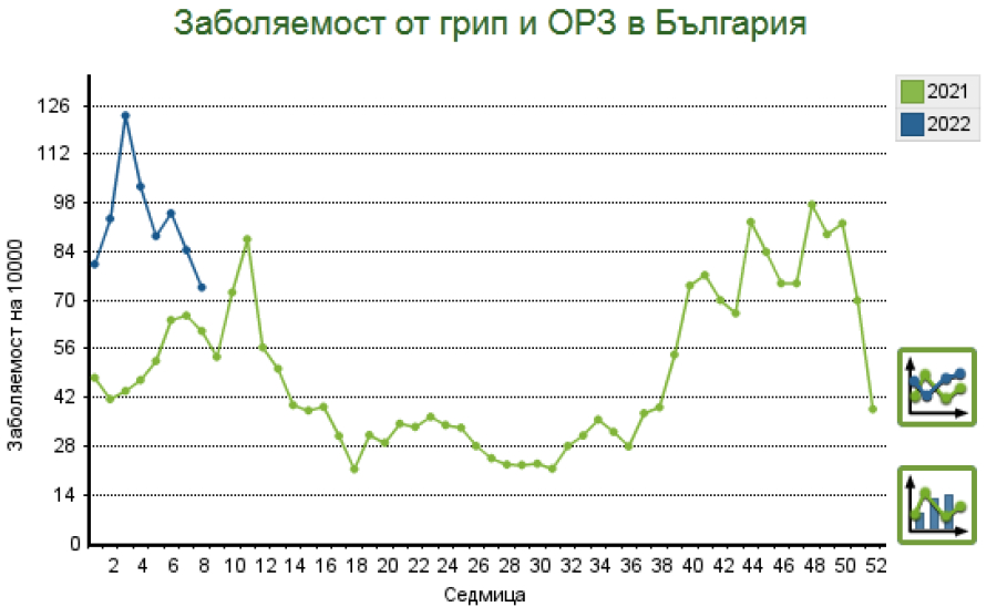 респираторни заболявания. Това сочат специализираните данни на Националния център, който следи заболеваемостта от грип и остри респираторни заболявания. 49 от пациентите са на възраст до 15 години, 21 от 30 до 64 годишна възраст. Двама - във възрастовата група 15-29.