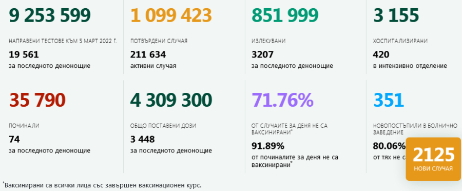 2125 са положителните за К19 теста в страната. Според учените-прогнозисти математици 5 март трябваше да е кулминацията на заболеваемостта с 50-70 000 за деннощието. Де ги тези учени. Ще кажат, ами методиката, която използвахме даваше такива данни. Като сте учени, защо тази методика са използвали, освен за да впечатляват и да плашат хората? Ако бяха коректни - щяха да дадат прогноза по различните методики...Ама не 50-70000...Как с такива учени да разработваш планове за действие, а?