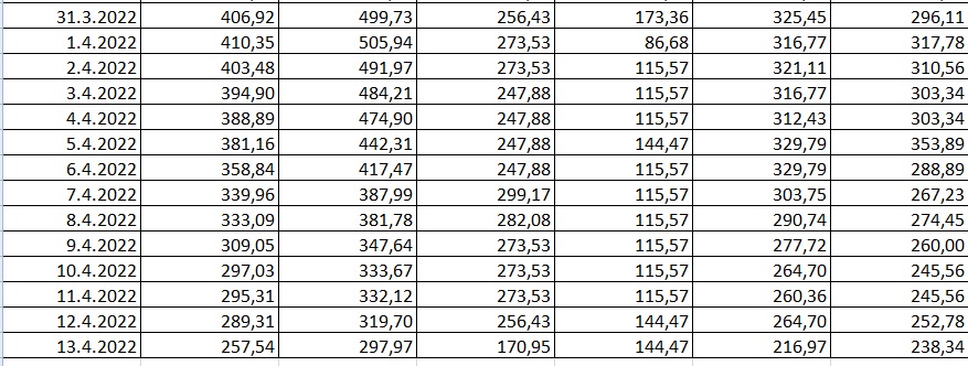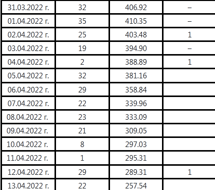 След датата е броят към 00.00 ч. на съответната дата, на регистрирани положителни за К19 теста, следва браят на положителните тестове за 14 дни към 100 хиляди души