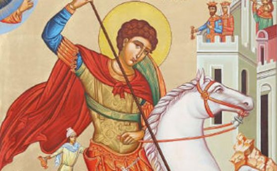 Св. Георги е роден в Кападокия, Мала Азия. Заради воинските си способности бил удостоен с военен чин трибун. Светецът ревностно проповядвал християнската вяра и затова бил затворен в тъмница и посечен през 305 г. Близо до гроба му се заселил змей, който опустошавал околността, владеел водите и всеки ден искал човешка жертва, за да ги пусне на хората. Когато дошъл ред на царската дъщеря, св. Георги убил змея с копието си и така я спасил. Заради това светецът се почита като пръв змееборец в християнството. На иконите можете да го видите въоръжен с копие и яхнал бял кон, а прободеният змей се гърчи в краката му.