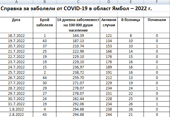 В последната седмица на юли 30 души в цяла Ямболска област са преминали през лекарските кабинети с респираторни оплаквания. 19 от тях са деца до 14 г. възраст. От 0 до 4 са 11. За сравнение предходната на посочената седмица от респираторно заболяване са се оплакали 25 човека 18 от тях до 14 г. възраст. Ковида също е остро респираторно заболяване...Ама го водят отделно Ковид....И ако някой му се наложи да постъпи в болница от каквото и да е, пък даде положителен тест за кковида им го пишат Ковид! Ако някой почине, от каквото и да е, но има положителен тест го пишат Ковид...