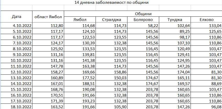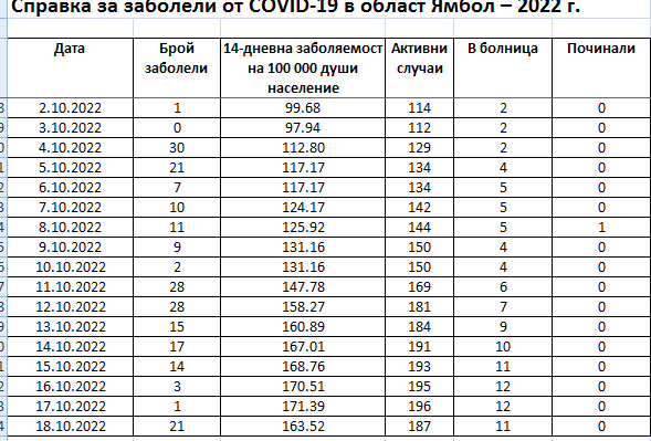 сочат табличните данни от днес 18-ти октомври на РЗИ-Ямбол. 21 положителни теста са отчетени с дата 18-ти. Починали в здравните заведения с К19 няма от /вж. таблицата/ Най-голямо е числото на сто хиляди души за община Болярово...