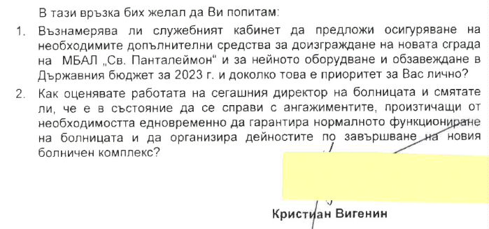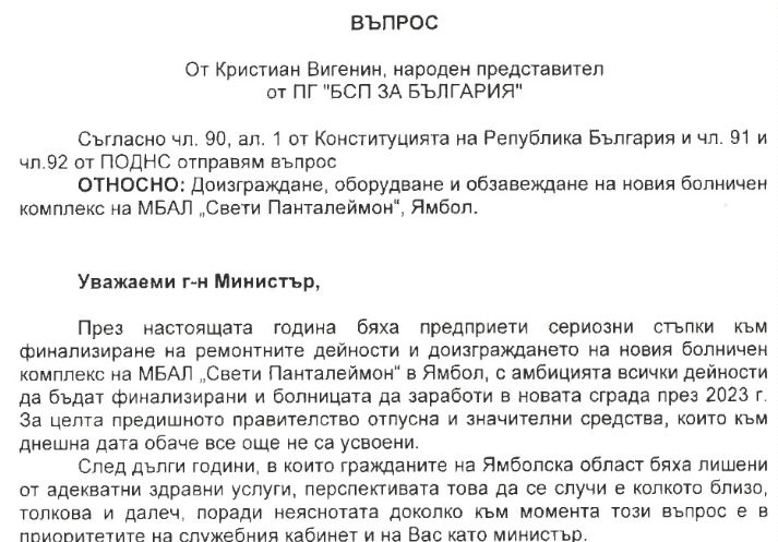 Депутатът Вигенин пита здравния министър за Новата болница