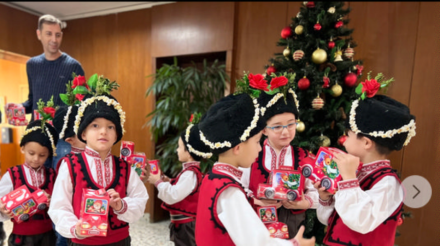 Коледарите от групите „Флупи“, „Делфи“, „Мечо Пух“ и „Ранобудно петле“ на Детска градина „Пламъче“ поздравиха кмета на община Ямбол Валентин Ревански и неговите заместници Енчо Керязов и Васил Александров.
