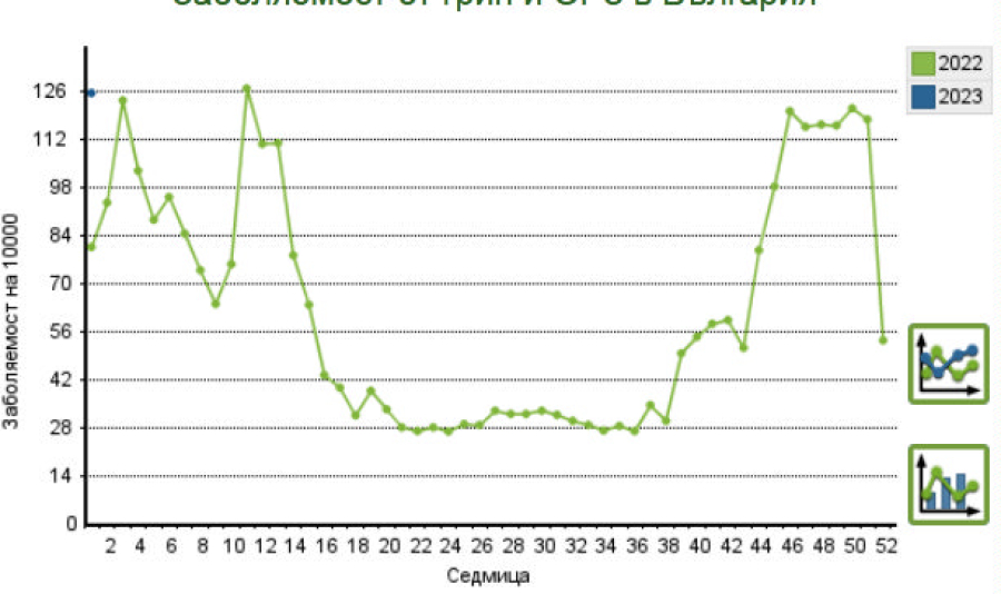 Средното за страната е 124.44 на 10 хиляди. За Бургас, за където всички национални тв. ютии пищят, че се чудят дали да обявят грипна посещенията с оплаквания за ОРЗ за миналата седмица са 194.11 на десет хиляди.