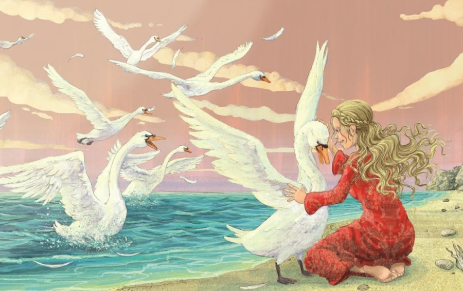 — Махайте се от очите ми и си изкарвайте хляба сами! — рече им злата царица. — Станете големи птици без глас! — Но все пак тя не можа да им стори толкова голямо зло, както бе намислила. Единайсетте князе се превърнаха във великолепни диви лебеди. Със странен крясък изхвръкнаха те през прозорците на палата и отлетяха далече зад парка и гората.