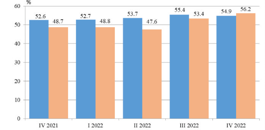 съответно 80.4% за мъжете и 68.9% за жените. В сравнение с предходното тримесечие този