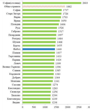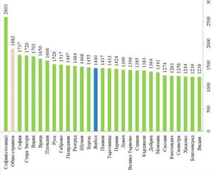 Загора - 1 726 лв., а най-ниско в областите Видин - 1 238 лв. и Благоевград - 1 239 лева.
