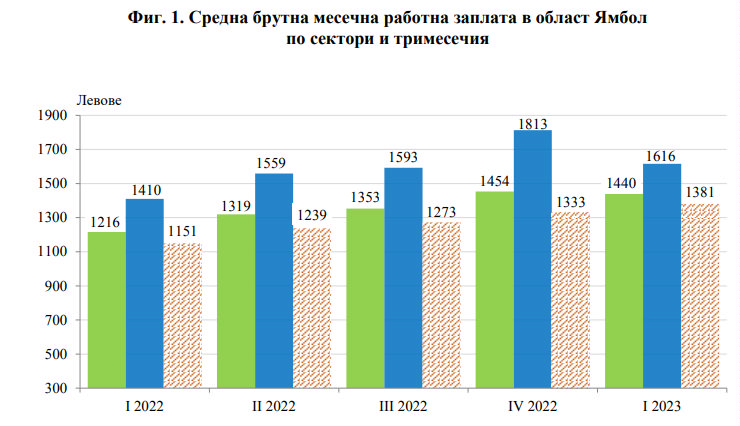Най-високо средно месечно трудово възнаграждение през първото тримесечие на 2023 г. са получили наетите лица по трудово и служебно правоотношение в секторите „Производство и разпределение на електрическа и топлинна енергия и на газообразни горива“, „Финансови и застрахователни дейности“ и „Държавно управление“. Най-нископлатени са били наетите лица в икономическите дейности „Хотелиерство и ресторантьорство“ и „Транспорт, складиране и пощи“. През първото тримесечие на 2023 г., област Ямбол е на 13-то място спрямо другите области в страната. Най-високо е заплащането в областите София (столица) - 2 603 лв., София - 1 737 лв. и Стара Загора - 1 726 лв., а най-ниско в областите Видин - 1 238 лв. и Благоевград - 1 239 лева.