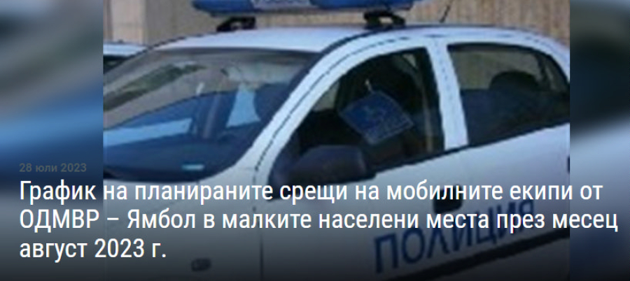 През месец август 2023 г. по утвърден график от директора на ОДМВР- Ямбол мобилни екипи, включващи служители от отдел „Охранителна полиция“ и секторите „Противодействие на криминалната престъпност“ и „Противодействие на икономическата престъпност“, ще посетят малки населени места и проведат срещи с представители на местната власт и жители по въпросите на сигурността и реда, както следва: