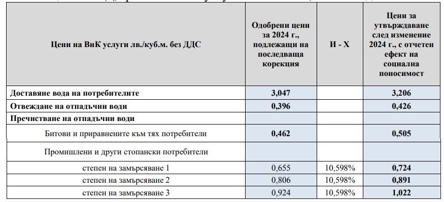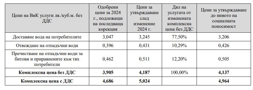Предложената за утвърждаване цена е била 5.024 /с отвеждане и пречистване/ лв. на куб.метър, но са приети тези цени, защото е взета предвид социалната поносимост