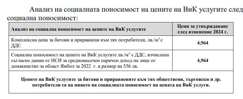 Според Позицията на обществения защитник социалната поносимост от 1 януари т.г. е била 5,53 лв./куб. м, при степен на грешка 15,9%, а от 1 януари 2024 г. социалната поносимост ще е 4,964 лв./куб. м, при степен на грешка 17,4%. Това е намаление на социалната поносимост с 10,31% спрямо предходната година, като това не е действителното положение на средните месечни доходи на едно лице от домакинството в област Ямбол, обяснява омбудсманът.
