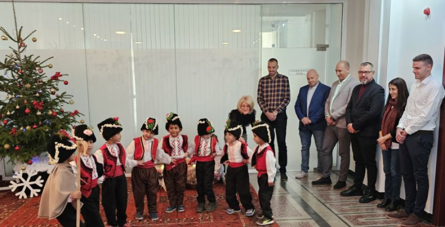 След хубавата среща вчера и доброто представяне на групата, днес нови приятни емоции донесоха коледарчетата от група „Калинка“ при Детска градина „Изворче“, с. Кабиле - филиал Хаджидимитрово. Талантливите деца пресъздадоха типичен обичай и поздравиха всички с изпълнението на песни и танци. Те бяха подготвили и ръчно изработени сувенири, които подариха на Станчо Ставрев - Кмет на Община „Тунджа“ и неговия екип, на Атанас Христов - Председател на Общински съвет „Тунджа“ и останалите присъстващи.