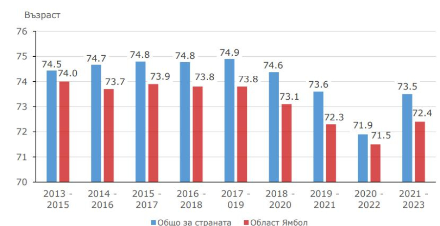 В периода между 2013 и 2023 очакваната средна продължителност на предстоящия живот в област Ямбол е намаляла с 0.3 години.