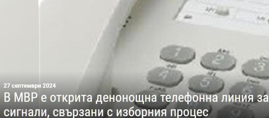 От 27 септември до 28 октомври 2024 г. в Министерството на вътрешните работи ще функционира денонощно открита линия - телефон 02 90 112 98 и имейл Този имейл адрес е защитен от спам ботове. Трябва да имате пусната JavaScript поддръжка, за да го видите. - за сигнали за нарушения или евентуални престъпления, съотносими към отговорностите на МВР в изборния процес.