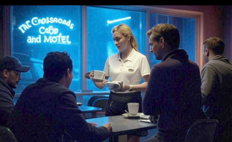 Неоновият надпис трептеше на фона на потъмняващото небе, хвърляйки непостоянни сини сенки върху паркинга на „The Crossroads Cafe and Motel“. Ели избърса плота за стотен път тази вечер, движенията й бяха механични, но грациозни, като танцьорка, изпълняваща добре отрепетирано изпълнение. Хромираните повърхности отразяваха нейния образ – млада жена с коса с цвят на мед, вързана на чиста опашка, зелени очи, които сякаш винаги гледаха отвъд хоризонта, и лице, за което клиентите често казваха, че принадлежи на кориците на списание, а не на персонал от закусвалнята.