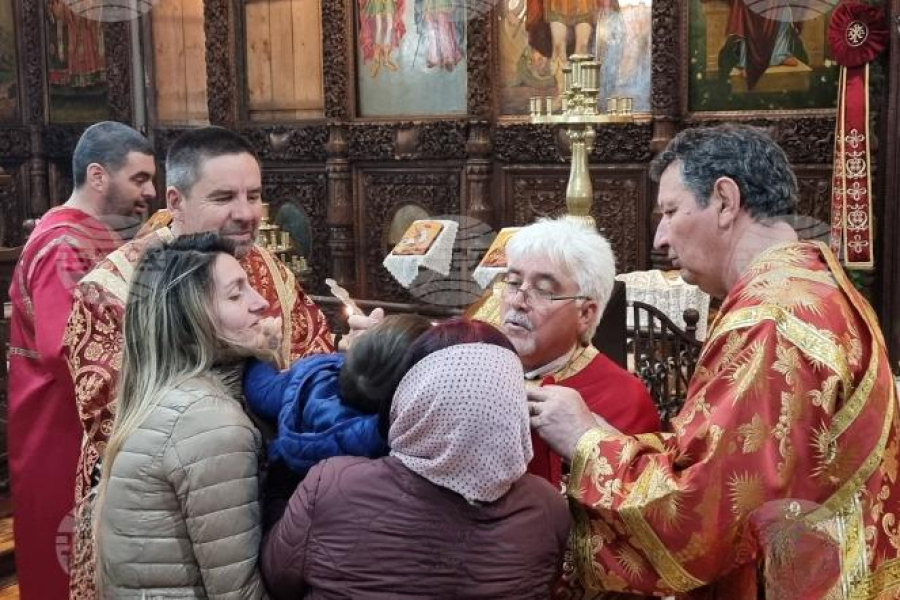 В богослужението в храм „Св. вмчк Георги Победоносец“ днес се включиха също отец Иван и отец Жельо от църквата „Св. Троица“, където в момента се извършва реставрация на иконостаса. След неделната служба свещениците раздадоха причастие и просфори (б. а. – нафора) на събралите се в храма миряни.