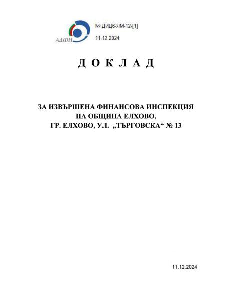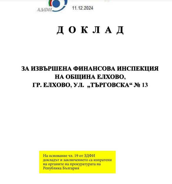 Агенцията за държавна финансова инспекция (АДФИ) приключи финансова проверка на Община Елхово, чийто доклад бе изпратен към прокуратурата на Република България, на 11 декември 2024 г. Инспекцията, проведена в периода от 31 октомври до 11 декември 2024 г., обхваща дейността на общината за – 2020, 2023 г., с фокус върху законосъобразността при разходването на бюджетни средства и управлението на обществени поръчки. Констатациите от проверката обаче не са публично оповестени в доклада, като се предполага, че е така, защото са предоставени изключително на органите на прокуратурата за по-нататъшно разследване.