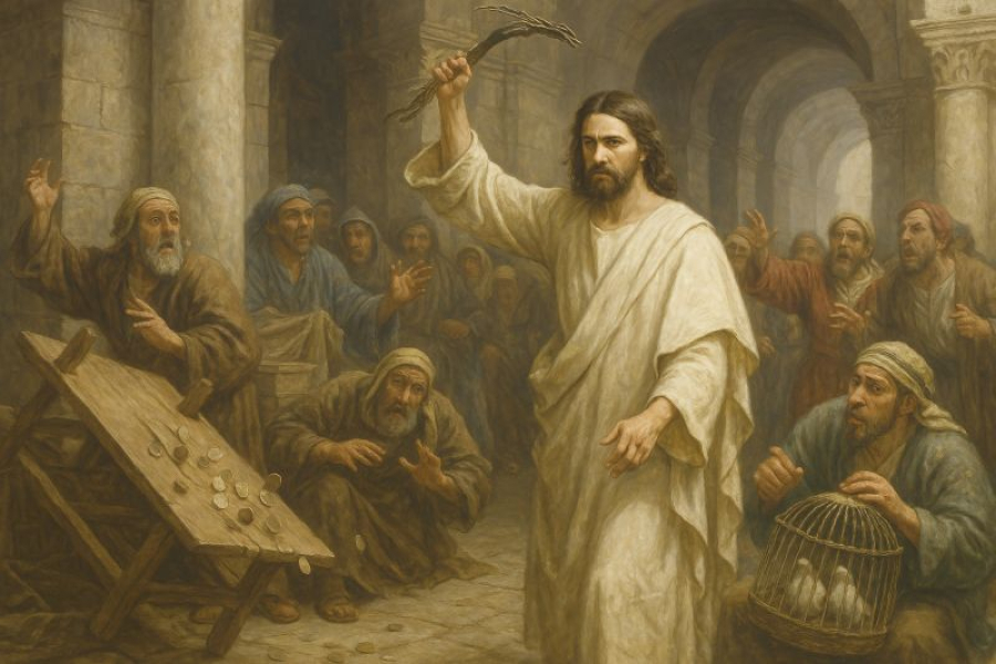 Това действие е не просто физическо прочистване, а пророчески акт – знак за божествения съд над институция, изгубила истинския си смисъл. Иисус не напада храма като място за молитва, а хората, които го оскверняват с корист и лицемерие.