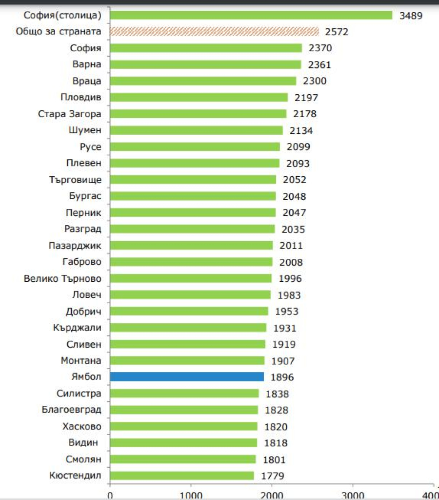 Мястото на Ямбол: Въпреки ръста, средната заплата в област Ямбол е с 676 лв. по-ниска от средната за страната , която е 2572 лв.. По този показател, област Ямбол се нарежда на