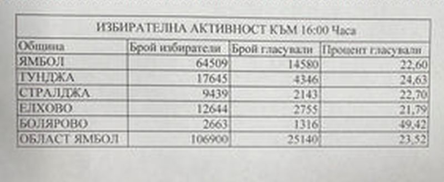 23.52 процента от избирателите в Ямболска област са гласували към 16 ч, 23.52 процента от избирателите в Ямболска област са гласували към 16 ч, сочат данни изпратени от Раайонната избирателна комисия