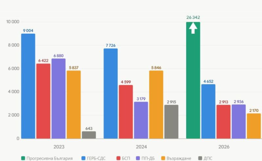 • ГЕРБ-СДС: Бележи постоянен низходящ тренд. През 2023 г. е първа сила с 9 004 гласа (25.8%)4. През 2024 г. запазва лидерството, макар и със спад до 7 726 гласа (23.6%)5. На сегашните избори през 2026 г. подкрепата за тях се срива до 4 652 гласа (9.7%), като те губят над 40% от избирателите си спрямо 2024 г., но все пак успяват да запазят 1 мандат1.