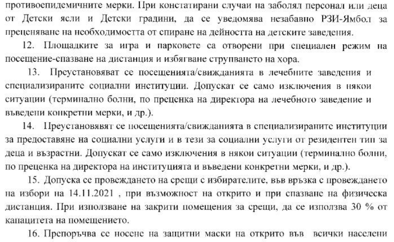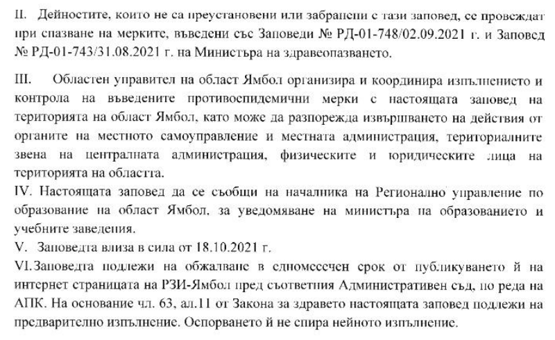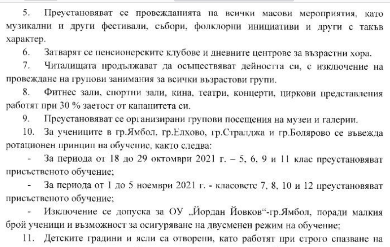 влиза в сила Заповед на директора на РЗИ Ямбол д-р Радостина Калчева за ОГРАНИЧИТЕЛНИ ПРИТИВОЕПИДЕМИЧНИ МЕРКИ. Журналисти приказват, че от понеделник щяло да има централни такива, но засега такива няма. В сила е Заповедта на д-р Калчева!!!