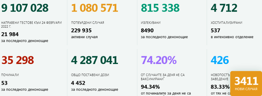 21 февруари - 1412 активни случая С К19 /изолирани хора/ в областта. Новите положителни теста за К19 са 8. За 14 дни - 1189. На сто хиляди е 1020.72. бустеризираните са - 11019