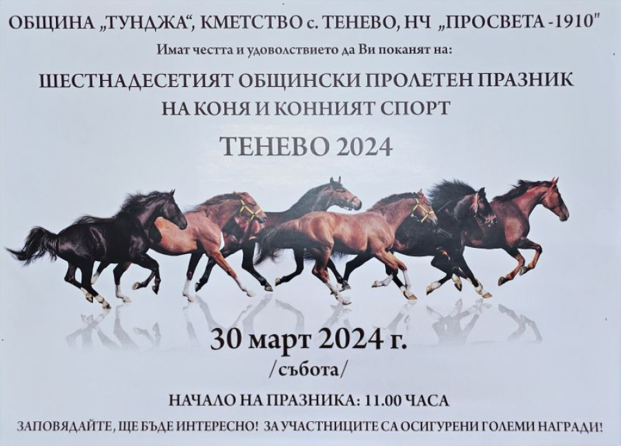 На 30 март 2024 г., от 11.00 часа, на Герена в село Тенево ще се проведе Общинския пролетен празник на коня и конния спорт.