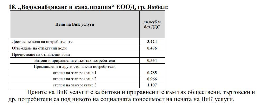Водоснабдяване и канализация“ ЕООД, гр. Ямбол С Решение № БП-Ц-19 от 31.08.2022 г. Комисията е одобрила бизнес план за развитие на дейността на „Водоснабдяване и канализация” ЕООД, гр. Ямбол като ВиК оператор за периода 2022-2026 г., утвърдила е цени на ВиК услуги за 2022г., считано от 01.09.2022 г., и е одобрила цени на ВиК услуги за 2023-2026 г. Периодът, за който следва да се приложи инфлация, съгласно чл. 6, т. 2 от НРЦВКУ, е м. септември 2022 г. – м. октомври 2024 г., като общият ИПЦ е в размер на 9,615% по данни на НСИ. С Решение № БП-Ц-19 от 31.08.2022 г. Комисията е определила коефициент Е за подобряване ефективността на дружеството за 2025 г. в размер на 9,180% от инфлационния индекс, или E2025= 0,883%. Информация за одобрените разходи за нови дейности и/или експлоатация и поддръжка на нови активи в одобрения бизнес план, реално отчетените от дружеството и признати от КЕВР разходи за 2023 г., формиращи коефициента Qр2025 за 2025 г., отразяващ разликата между прогнозните и действителните разходи, които са в резултат на осъществяване на нови дейности и/или експлоатация и поддръжка на нови активи: