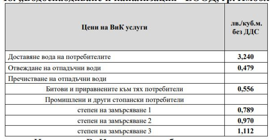 Според решението на регулатора, цената за доставяне на вода на потребителите ще бъде 3,24 лева за кубически метър (без ДДС). За отвеждане на отпадъчни води гражданите ще заплащат 0,479 лв./куб.м, а за пречистване - 0,556 лв./куб.м.