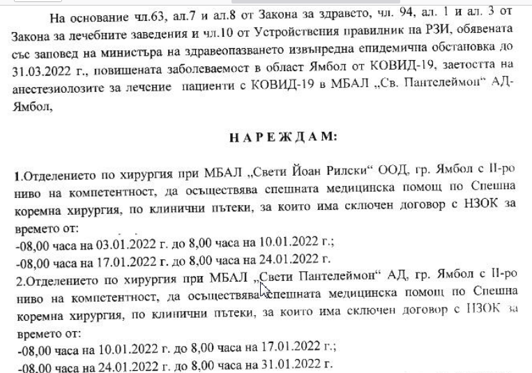 за спешната коремна хирургия ще се редуват съответните отделения в многопрофилните болници за активно лечение. Съогтветна Заповед е издал директорът на РЗИ-Ямбол д-р Радостина Калчева Николова