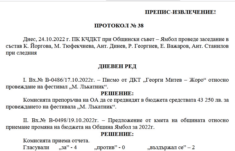 Днес, 24.10.2022 г. ПК КЧДКТ при Общински съвет – Ямбол проведе заседание в