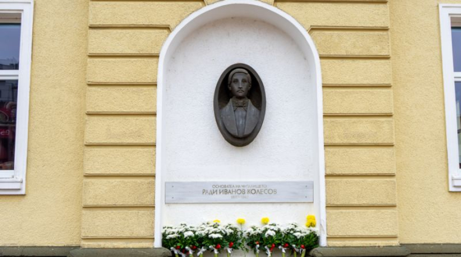 Поднасяне на венци и цветя пред барелефа на ямболския книжовник, поет, преводач и революционер Ради Иванов Колесов на фасадата на Народно читалище „Съгласие-1862“